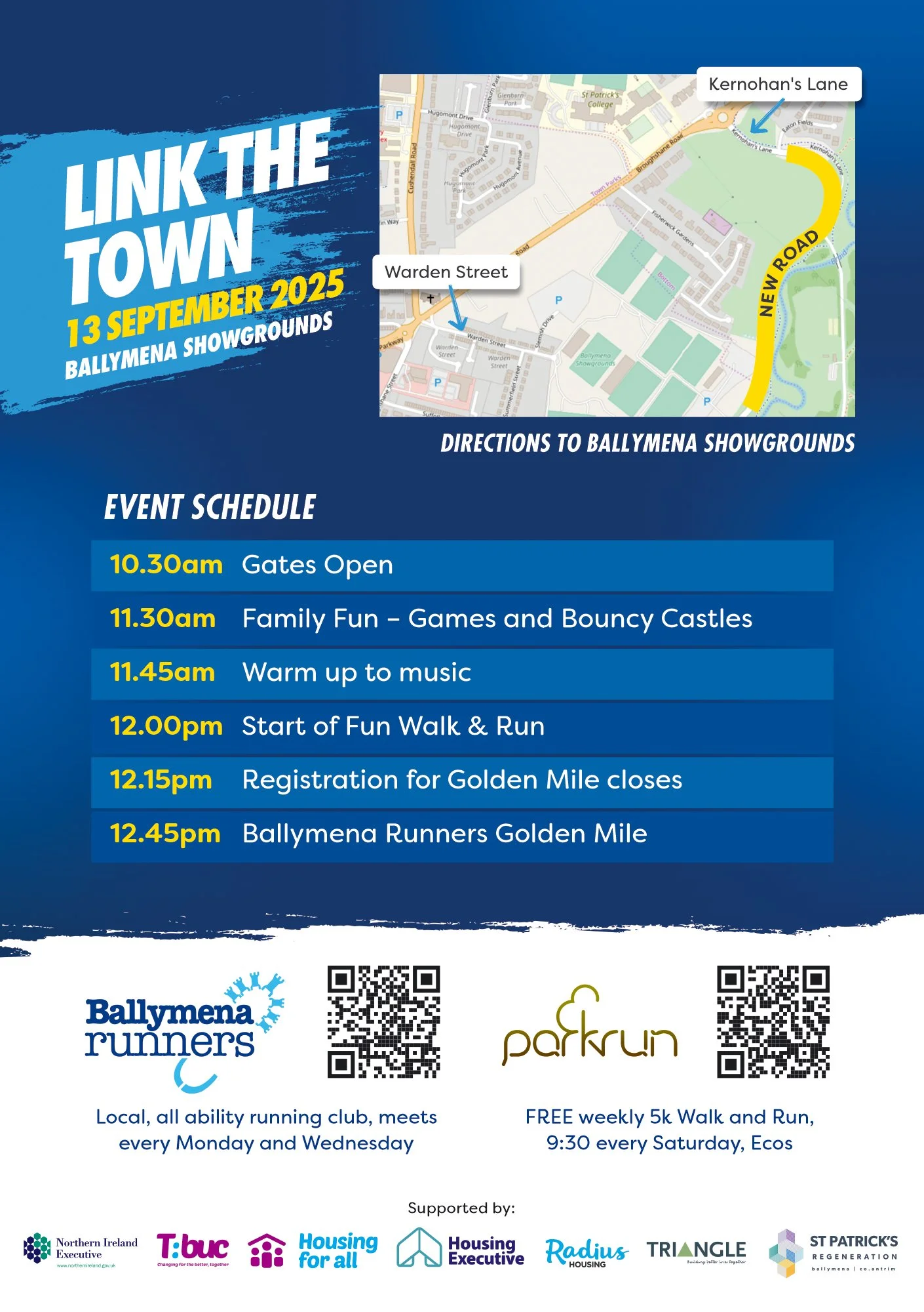 The Club and Radius Housing are organising the Link the Town free community event on Saturday 13 September 2025 at Ballymena Showgrounds. The event features: